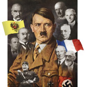 Bildquelle 2: Sie alle ermöglichten Hitlers Aufstieg zur Macht mit der Leistung oder Vermittlung teils erheblicher Geldspenden: Gegen den Uhrzeigersinn von links nach rechts: John Pierpont Morgan, amerikanischer Bankier, adlige Exilrussen, die das Zarenreich (Flagge) wiederherstellen wollten; Dr. Max Erwin von Scheubner-Richter; Kurt Lüdecke; Benito Mussolini; Emil Kirdorf; John D. Rockefeller; Frankreich; Stahlbaron Fritz Thyssen; Henry Ford, US-Autokönig; Dietrick Eckardt sowie die IG Farben. Auch Hermann von Siemens, der Großbankier Kurt Freiherr von Schröder und der Medienzar Alfred Hugenberg unterstützen die Hitlerpartei. |