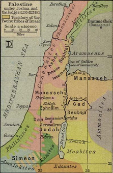 | Bildquelle 5: Östliche Mittelmeerküste zur Zeit der Landnahme. Die Hebräer waren nicht die einzigen, die um 1200 v. u. Z. das Land an der östlichen Mittelmeerküste als Siedlungsgebiet zu nutzen begannen: die Philister siedelten sich (aus Kleinasien oder von Kreta kommend?) im Zuge des so genannten Seevölkersturms ebenfalls an der Küste Palästinas an. Immer wieder (nach dem Richterbuch vor allem, wenn sie Gott untreu werden und andere Götter verehren) spürten die Israeliten deren militärische Überlegenheit (Waffen aus Eisen, Streitwagen). |