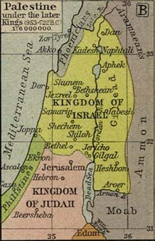 Israel nach der Reichsteilung. Die immer wieder aufflackernden Rivalitäten zwischen den 10 Nord- und 2 Südstämmen bricht unter Salomos Nachfolger Rehabeam wieder auf. Als er sich weigert, die Fronlast zu erleichtern, sagt sich der Norden vom Haus Davids los (926). Es entsteht das Nordreich mit seiner späteren Hauptstadt Samaria (Šom?rôn, aram. Šam?rayin), im AT meist Israel oder nach der Hst. Samaria genannt. Der verbleibende Rest mit der Hst. Jerusalem wird fortan Juda (Y?hûdâ) genannt. |