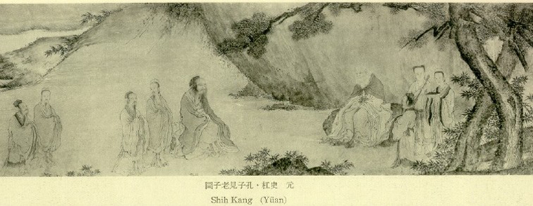Bildquelle 5: Konfuzius trifft Laozi : Das „Zhuangzi“ enthält einige amüsante ausgedachte Geschichten über das Zusammentreffen der beiden Meister. Der große chinesische Philosoph, Begründer einer Beamtenschule und Sammler der Schriften der Vergangenheit Konfuzius (Kung-tzu) (551–479 v.u.Z.) brachte am Ende des 6. Jahrhunderts die Ideen der sozialen Gruppe der Krieger und Gelehrten des Chou (Zhou)-Reiches, den Schih, zum Ausdruck, die von der Macht eines einheitlichen Zhou-Reiches träumten. Er lehrte, dass alle Fürsten Chinas eine große Familie bildeten, die im Ahnendienst der Herrscher ihre Gemeinsamkeit kundzutun hätten. Er organisierte ein strenges Reglement staatlicher Riten und Ordnungen und verlangte von den sich zur Beamtenschaft entwickelnden Schih, im so genannten Sohn des Himmels, dem Kaiser, ihren Herrn große Familie bildeten, die im Ahnendienst der Herrscher ihre Gemeinsamkeit kundzutun hätten. Er organisierte ein strenges Reglement staatlicher Riten und Ordnungen und verlangte von den sich zur Beamtenschaft entwickelnden Schih, im so genannten Sohn des Himmels, dem Kaiser, ihren Herrn anzuerkennen und ihm stets unbedingte Treue zu halten. Seine Lehre blieb noch mehrere Jahrhunderte Theorie und anstrebenswertes Ideal, bis sie ab der Wende vom 1. zum 2. Jahrhundert n.u.Z. den Rang einer regelrechten Staatsreligion erhielt. Die geistige Reform des Konfuzius zum Ende des 6. Jahrhunderts vor unserer Zeitrechnung in China fand in den gleichen Jahrzehnten ihre durchaus Ähnlichkeiten aufweisenden Entsprechungen in Indien durch Siddhartha Gautama (Buddha) und im Iran durch Zarathuschtra. Mit den auch diesem Text zugrunde liegenden „Gesprächen“ (Lun Yü) verfügt die Nachwelt über eine Aufzeichnung von Aphorismen über den geistigen Gehalt seines Schaffens. Es gehört zu Kungtses bleibenden Verdiensten, als Privatmann anhand der alten Urkunden die Überlieferung der sonst nur in den öffentlichen Anstalten den Söhnen der Herrscherhäuser als Lehrmaterial vorbehaltenen alten Kulturschätze seinen Schülern, egal ob arm oder reich, jedoch abhängig vom guten Willen eines jeden von ihnen zu selbstständiger geistiger Arbeit vermittelt zu haben. Die Grundlage seiner Lehrtätigkeit bildeten das Buch der Lieder (Schì´ Ging), die Urkunden (SchangSchu oder Schu Ging), die Sitten und Musik (Li), in späterer Zeit auch das Buch der Wandlungen (Dschou I) und die Frühling- und Herbstannalen des Staates Lu (TschunTsiu). Das Ausmaß der eigenen geistigen Urheberschaft Kungtses für diese Werke bleibt umstritten. Neuere Forschungen gehen davon aus, dass er sich schon vorhandener Textbücher bediente. Fest steht allerdings der große Anteil der konfuzianischen Schule an der Pflege und Überlieferung dieser Texte, von denen heute noch die Lieder, das Buch der Wandlungen und die Frühling- und Herbstannalen bestehen, wobei das ursprüngliche Buch der Urkunden zulasten teilweiser späterer Fälschungen empfindlich gelitten hat. Bei den Liedern (Li) verhält es sich ähnlich. Es bleibt ungewiss, ob sie überhaupt jemals als gesonderte Texte existiert haben, oder ob es sich nur um eine feste Tradition der Übung handelte, bei der die Musik später ganz verlorenging, während die Sittenregeln später in den Aufzeichnungen der Sitte (Li Gi) Eingang fanden. (28)