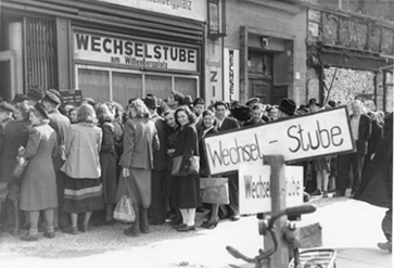 | Bildquelle 9: Schlangen an den Wechselstuben nach Einführung der Westwährung im westlichen Teil Berlins hier am im britischen Sektor gelegenen Charlottenburger Wittenbergplatz, um in den Besitz der neuen harten Westwährung zu gelangen. |