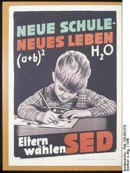 Das Wahlplakat der SED von 1946 wirbt für einen Neubeginn im Bildungswesen. Die SED propagiert in dieser Zeit keine sozialistischen Ziele. |