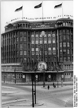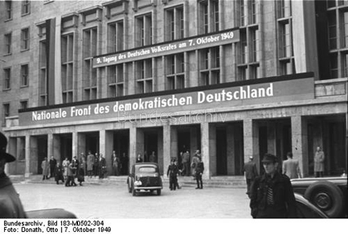 Bildquelle 3: Das Gebäude der DWK in der Leipziger Straße am 7.10.1949. Dort fand, wie das obige Transparent zeigt, am 7.10.1949 die 9. Tagung des Deutschen Volksrates statt, auf der die Teilnehmer das Manifest der Nationalen Front des demokratischen Deutschland verkündeten. Der Deutsche Volksrat konstituierte sich an diesem Tag zur Provisorischen Volkskammer der DDR.