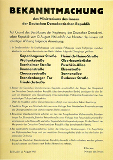 | Bildquelle 9: Diese Bekanntmachung verspricht den Ostberlinern und den Bewohnern der umliegenden DDR unter 2. eine besondere Genehmigung für den Besuch Westberlins, die sie bei den zuständigen Volkspolizei Kreisämtern bzw. der Volkspolizei Inspektion erhalten sollen, wofür eine besondere Bekanntmachung in Aussicht gestellt wurde. Darauf mussten die Leute 28 Jahre warten. |