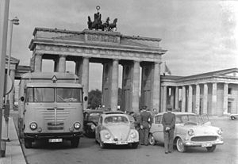 Bildquelle 10: Sonntag 13.8.1961. Westberliner dürfen den an diesem Tag den noch offenen Übergang am Brandenburger Tor nach Tiergarten benutzen. Einen Tag später schließen die Ostberliner Sicherheitskräfte auf Geheiß der Einheitssozialisten das Brandenburger Tor. Damit wird auch die nebenstehende Bekanntmachung des Innenministeriums bezüglich der zu benutzenden Übergänge nicht nur für diesen Ort hinfällig.