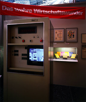 Ausstellungsszenerie NÖSPL mit der Baugruppensteuerung BNC 3 in der Dauerausstellung Haus der Geschichte der Bundesrepublik Deutschland. Seit 1967 ging im VEB Numerik Karl-Marx-Stadt die für den gesamten Ostblock bestimmte, und damals noch durchaus international wettbewerbsfähige erste numerische Baugruppensteuerung der DDR in Serie. Die Versuche, mit Hilfe von NÖSPL eine spürbare Modernisierung der DDR-Wirtschaft in Gang zu setzen, scheiterten am Widerstand der Politführer in Moskau und Ost-Berlin, die die Herrschaft der in beiden Staaten führenden Parteien über wirtschaftliche Wirksamkeitsbestrebungen stellten. |