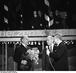 | Bildquelle15: Walter Ulbricht und Max Fechner in der die sozialistische Menschengemeinschaft propagierenden beliebten Unterhaltungssendung "Mit dem Herzen dabei" am 16.04.1966 auf der Bühne des Friedrichstadt-Palastes, wo der durchs Programm führende Hans-Georg Ponesky den Partei- und Staatsratsvorsitzenden unter dem Gelächter von über 3000 begeisterten Zuschauern vorsichtig zu verulken versuchte. Da die Sendung life ausgestrahlt wurde, bekamen auch die Millionen Zuschauer an den Fernsehbildschirmen Ulbrichts sichtbare Verärgerung über die Belustigungsversuche Poneskys auf seine Kosten mit. Wegen dieser „Majestätsbeleidigung“ verschwand Ponesky kurze Zeit später mit samt der von ihm konzipierten Sendung bis zu Ulbrichts Sturz in der Versenkung. Die sozialistische Menschengemeinschaft folgte nach. |