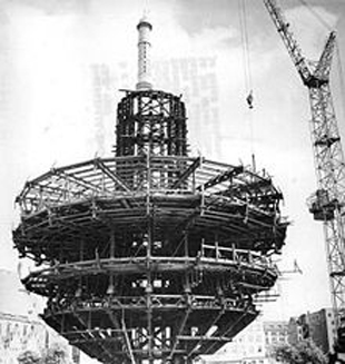 | Bildquelle 17: Am 18.8.1967 aufgenommene Montage des Kugelskeletts am Boden. Das Stahlskelett der Turmkugel des Fernsehturmes auf einem Platz vor dem Berliner Rathaus wuchs durch die Arbeit der. Monteure des VEB Industriemontage Leipzig. Die Turmkugel wurde später in einer Höhe von 200 Meter - etwa in der Höhe des hier sichtbaren Teils des Turmes - montiert. In dieser Höhe befinden sich bis heute das Café und die Aussichtsplattform des Turmes. Der Fernsehturm wurde zum 20. Jahrestag der DDR fertig. |