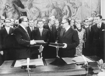 Bildquelle 20: Unterzeichnung des Grundlagenvertrags zwischen den beiden deutschen Staaten 1972 durch Bundesminister Egon Bahr und DDR-Staatssekretär Michael Kohl. Obwohl sich beide Seiten vertraglich einigten, in der nationalen Frage uneinig bleiben zu wollen, ebnete der Vertrag den Weg für die Anerkennung der Eigenstaatlichkeit der DDR durch Drittstaaten. Die Verantwortlichkeiten der vier Mächte für Deutschland und Berlin als Ganzes blieben davon unberührt. |