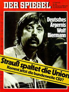Bildquelle 22: Wolf Biermann beim Konzert in Köln am 13.11.1976. Da die SED Führung fest damit rechnen konnte, dass der Liedermacher bei seinem Westauftritt das Regime scharf angreifen würde, war die Ausbürgerung als Reaktion darauf wohl schon bei der Genehmigung für die Ausreise vorprogrammiert. Er selber gab den SED-Funktionären durch seine polemischen Angriffe auf die vorgeblich spießige systemerhaltende Angepasstheit der Arbeiterschaft eine Steilvorlage für ihr rigoroses Vorgehen. Das Westfernsehen übertrug die Veranstaltung life, wodurch Millionen Menschen vor allem im Osten überhaupt erst Kenntnis von dieser Art innerer DDR-Opposition bekamen. An der Ostberliner Humboldt Universität gab es unter Studenten heftigen Streit um die Berechtigung der Biermannschen Kritik an der Arbeiterschaft. |