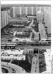 Bildquelle 24: Grünanlage zwischen den Wohnblöcken 1981 (Blick von einem Hochhaus am Springpfuhl Richtung Süden). In der Hauptstadt Ost-Berlin bildeten die Ortsteile und späteren neuen Stadtbezirke Marzahn und Hellersdorf die Schwerpunkte für östliche Stadtrandbebauung. Wegen der hauptstädtischen Schaufensterfunktion des Ostteils von Berlin kamen die dortigen Bewohner auch in den Genuss einer besseren Versorgung, wenngleich auch in Ostberlin viele Wünsche offen blieben. |