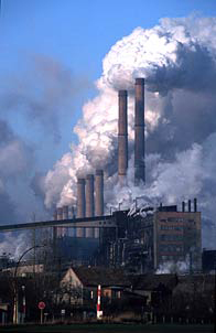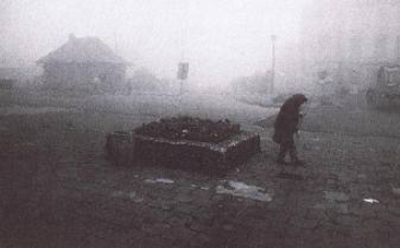 | Bildquelle 25: Smog in Bitterfeld in den 1980er Jahren. In dieser Gegend lag der Schwerpunkt der Braunkohleförderung in der DDR, wodurch die Landschaft großflächig in Mitleidenschaft gezogen wurde. Das elektrochemische Kombinat und die nahe gelegene Filmfabrik Wolfen taten das ihrige um die Umwelt in hohem Maße zu belasten, was zu unerträglichen Gesundheitsschädigungen der dort lebenden Bevölkerung führte. |