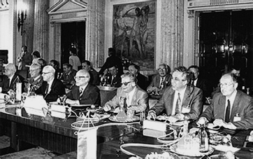 | Bildquelle 27: DDR-Delegation während des Gipfeltreffens der Warschauer-Pakt-Staaten in Bukarest am 7. Juli 1989: Oskar Fischer, Egon Krenz, Hermann Axen, Erich Honecker, Willi Stoph, Heinz Kessler, Günter Mittag (v. re.) Wenige Wochen später ließ Ungarn die Grenzen für DDR-Bürger öffnen, was den Anfang vom Ende einläutete. Man erkennt unschwer in den Gesichtern die Anspannung wegen der kritischen Lage zu Hause. |
