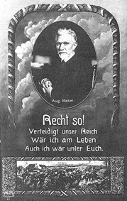 Plakat der SPD, mit der sie ihren Übertritt ins Lager der Herrschenden mit Bebel zu begründen sucht. Der hatte einmal wegen der Erfahrungen mit der Niederschlagung der 1848 Revolution durch zaristisch russische Truppen erklärt, dass er trotz seiner rigorosen Ablehnung eines von den Imperialisten angezettelten Krieges bei einem Angriff des zaristischen Russland auf das Reich, selbst einen Karabiner in die Hand nehmen würde, um die eigenen Errungenschaften zu verteidigen. Russland hatte tatsächlich zuerst den Krieg erklärt und war am 1.8.1914 in Ostpreußen eingefallen. |
