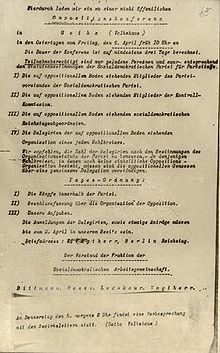 Einladung zur Konferenz in Gotha, auf der die USPD im April 1917 gegründet wurde. Diese Partei wirkte als linke Abspaltung von der SPD bis 1924 und kehrte dann teilweise wieder in den Schoß der SPD zurück. Der andere Teil vereinigte sich mit der KPD. |
